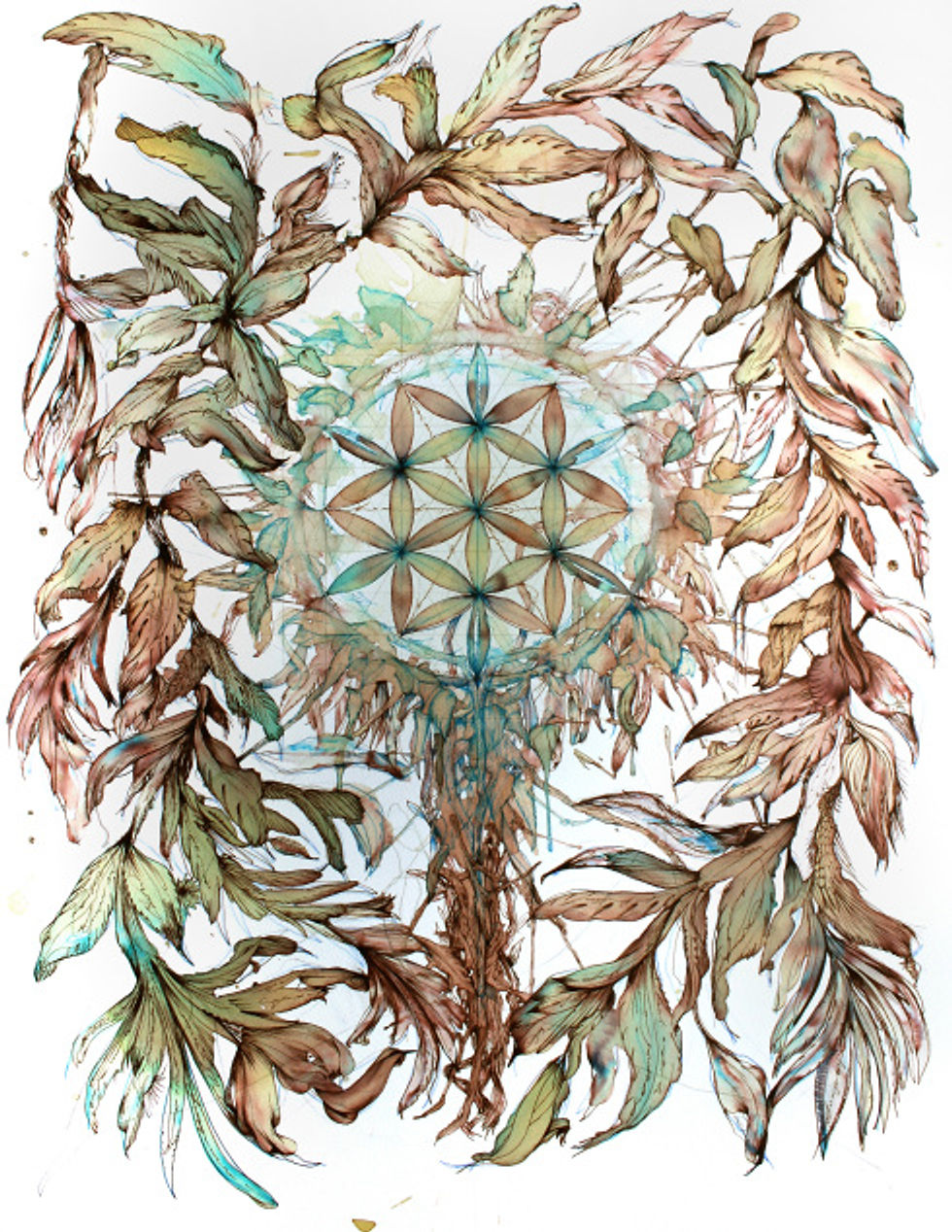 Continued work on this piece adding more foliage to the background and colour to the central motif to draw the eye, exploring the relationships between geometry and floral pattern, and learning more about this floral pattern which figures as part of many civilisations through its connection with sacred geometry.
